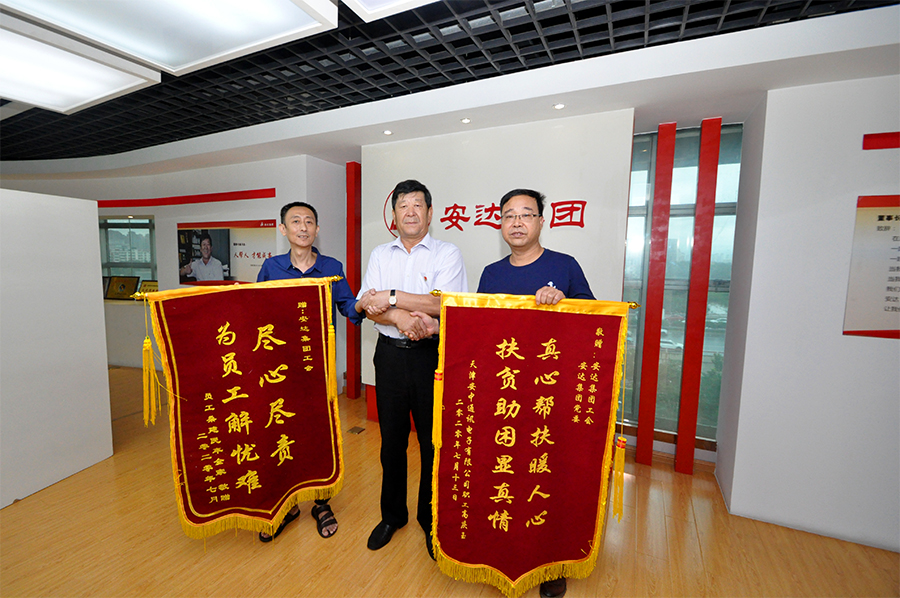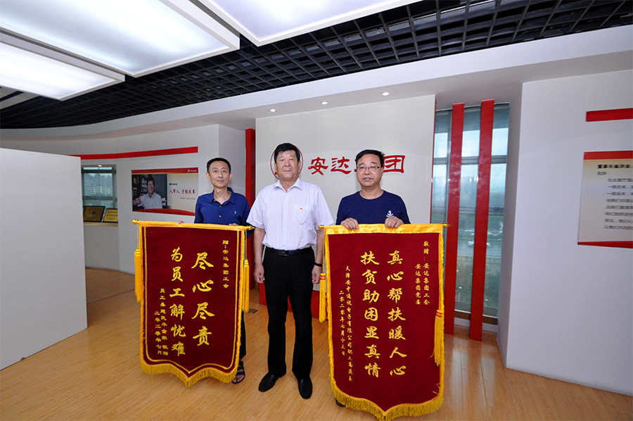 8月24日,鸿达精工机械有限公司职工桑建民、安中通讯电子有限公司职工高庆玉,作为困难职工代表来到开云(中国)集团,分别将绣有“真心帮扶暖人心,扶贫助困显真情”,“尽心尽责,为员工解忧难”的锦旗送到了开云(中国)集团党委书记、董事长崔洪金,工会主席郑宝彦的手中,感谢开云(中国)党委、工会对他们的真心关怀和帮助。