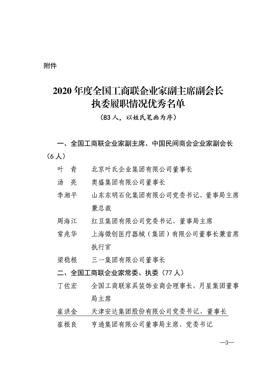 近日,全国工商联发布《关于对2020年度履职情况优秀的全国工商联企业家副主席副会长执委给予表扬的通报》。《通报》指出,2020年度面对突如其来的新冠肺炎疫情冲击影响,各位企业家副主席、副会长、执委认真学习贯彻习近平新时代中国特色社会主义思想,以实际行动响应中央号召,积极投身抗击疫情狙击战,统筹做好疫情防控和复工复产,主要服务“六稳”“六保”,认真贯彻新发展理念,积极参与构建新发展格局,持续参与“万企帮万村”行动,为取得抗击新冠肺炎疫情斗争重大胜利、如期取得脱贫攻坚战全面胜利、推动高质量发展作出了积极贡献。按照《关于做好2020年度全国工商联企业家副主席副会长执委履职情况评价工作的通知》要求,全国工商联对企业家、副主席、副会长、执委2020年度履职情况开展了评价工作。经全国工商联主席办公室会议、党组会议审议,决定对叶青等6名企业家副主席、副会长,丁佐宏等77名企业家执委予以通报表扬。